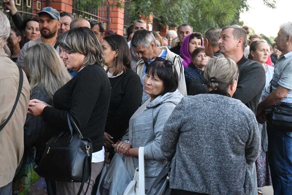 8月13日,在俄羅斯庫爾斯克市,來自俄烏邊境地區(qū)的居民排隊領取救援物資。新華社發(fā)