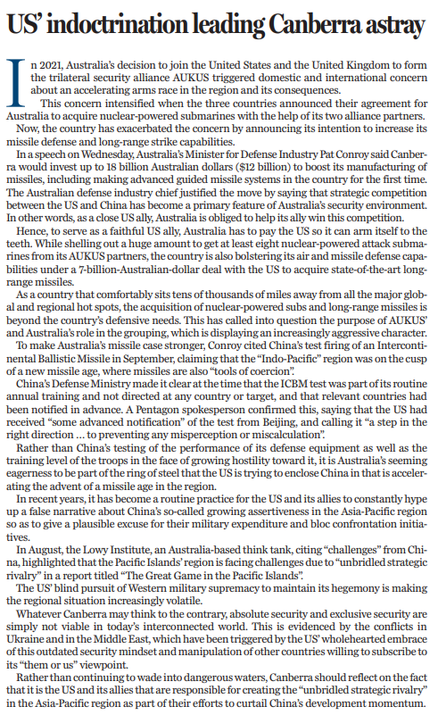 現(xiàn)在,澳大利亞不僅不思悔改,反而又宣布要加強(qiáng)導(dǎo)彈防御和遠(yuǎn)程打擊能力,進(jìn)一步加劇了人們的憂慮。