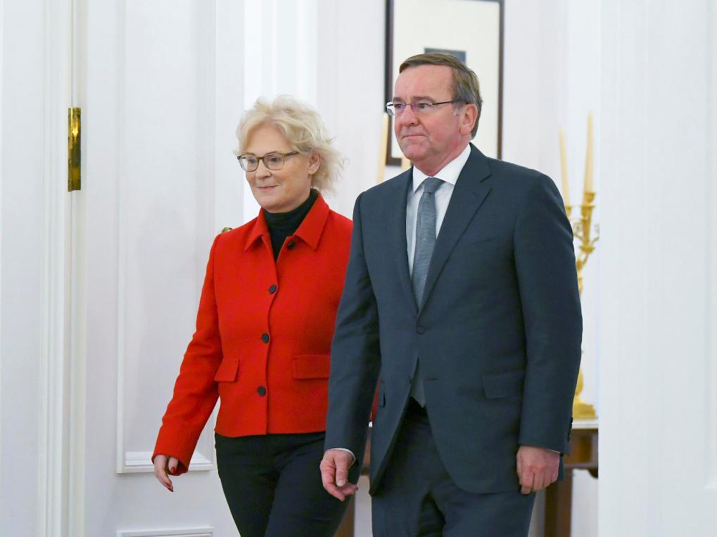 2023年1月19日,在德國(guó)柏林的總統(tǒng)府,皮斯托里烏斯(右)步入儀式現(xiàn)場(chǎng)。德國(guó)總統(tǒng)施泰因邁爾當(dāng)日向鮑里斯·皮斯托里烏斯頒發(fā)任命書(shū),正式任命其為國(guó)防部長(zhǎng)。新華社記者任鵬飛攝