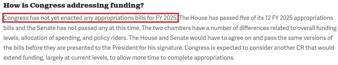 和以往一樣,白宮今年3月提出的2025財(cái)年預(yù)算案包含需要由國(guó)會(huì)中不同撥款委員會(huì)審批、分別為政府各機(jī)構(gòu)提供資金的12項(xiàng)撥款計(jì)劃,但這些年度撥款計(jì)劃迄今無(wú)一被國(guó)會(huì)通過(guò)。