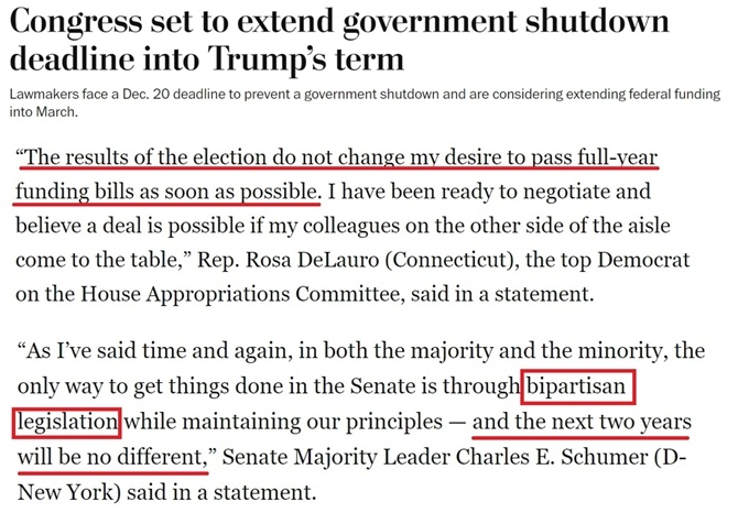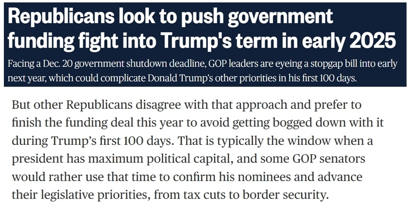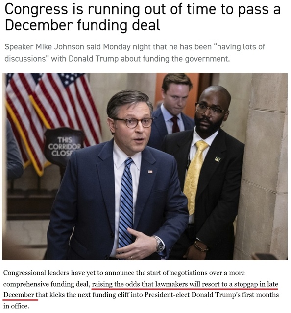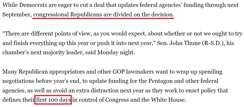 據(jù)報(bào)道,不少共和黨議員、特別是負(fù)責(zé)撥款的議員希望在年底前完成新財(cái)年的總預(yù)算支出談判,避免給特朗普的新政府明年上任后制定政策時(shí)帶來(lái)額外干擾,因?yàn)檫@些政策將“決定他們控制國(guó)會(huì)和白宮的頭100天”。
