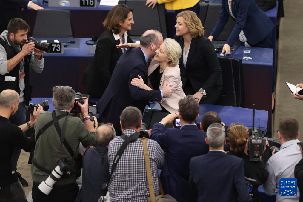 11月27日,在法國斯特拉斯堡歐洲議會會議現場,馮德萊恩(中右)在新一屆歐盟委員會(歐委會)委員名單投票通過后慶祝。新華社記者 趙丁喆 攝