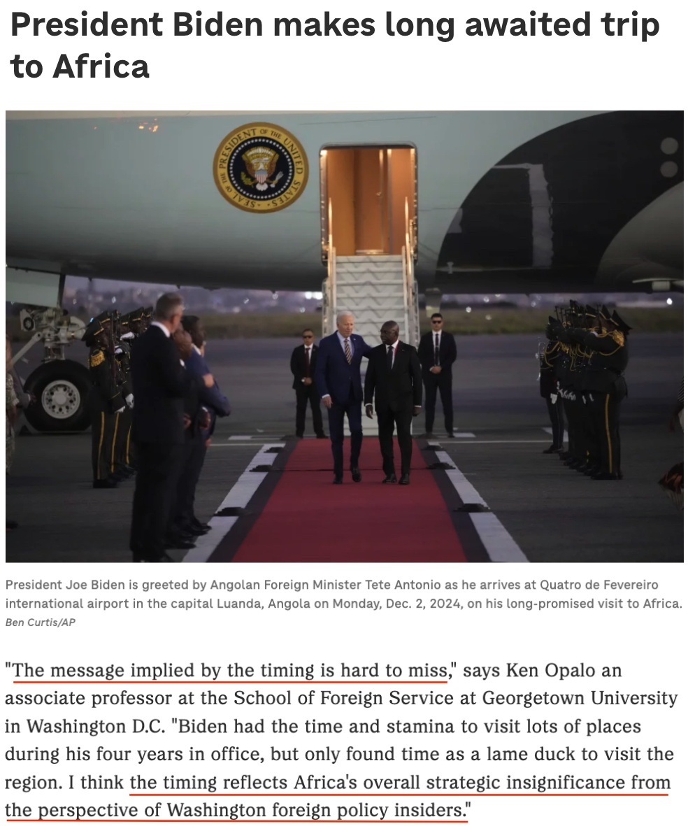 美國華盛頓特區(qū)喬治城大學(xué)外交學(xué)院副教授肯·奧帕羅認(rèn)為,拜登在即將卸任時才抽出時間訪問非洲地區(qū),“從華盛頓外交政策內(nèi)部人士的角度來看,這個時機(jī)反映了非洲在美國總體戰(zhàn)略中的不重要性”。