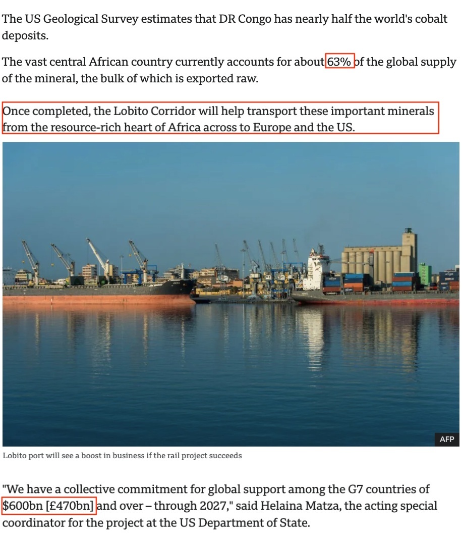 “洛比托走廊”是剛果(金)、贊比亞和安哥拉這三個非洲國家以及美國、其他七國集團(tuán)(G7)成員國和私人投資者之間的一個聯(lián)合項目。這條全長1344公里的鐵路線將剛果(金)的鈷、鋰和銅礦以及贊比亞的銅帶地區(qū)連接到安哥拉的大西洋港口城市洛比托。
