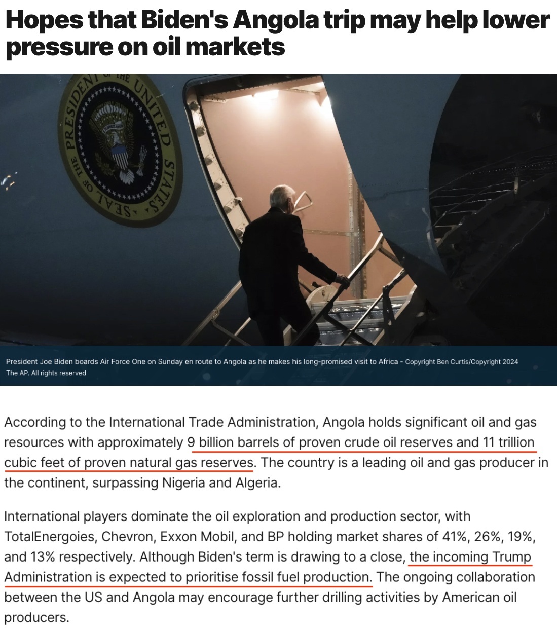 雖然拜登的任期即將結(jié)束,但預(yù)計即將上任的特朗普政府將優(yōu)先考慮化石燃料生產(chǎn)。美國和安哥拉之間正在進(jìn)行的合作可能會鼓勵美國石油生產(chǎn)商進(jìn)一步開展鉆探活動。