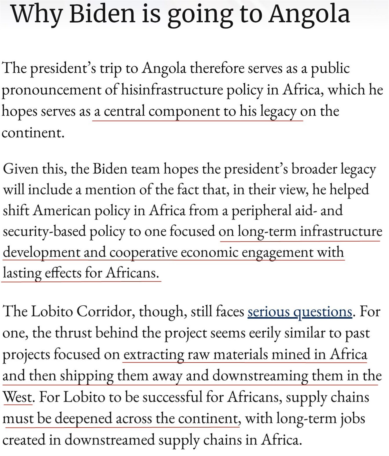 文章認(rèn)為,“洛比托走廊”要想在非洲取得成功,就必須深化整個非洲大陸的供應(yīng)鏈,在非洲的下游供應(yīng)鏈中創(chuàng)造長期就業(yè)機(jī)會,但這顯然不是美國的優(yōu)先考慮。
