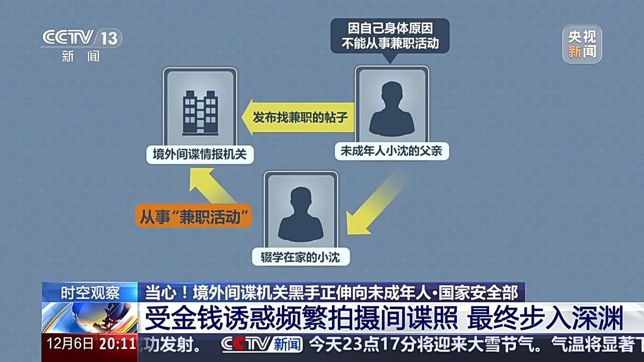 近年來,國家安全機關(guān)在案件偵辦中發(fā)現(xiàn),境外間諜情報機關(guān)常以網(wǎng)絡(luò)兼職、異性交友為名,通過網(wǎng)絡(luò)等渠道對未成年人實施勾連。鎖定目標(biāo)之后,境外間諜情報機關(guān)會許諾提供報酬豐厚、內(nèi)容簡單的兼職機會,一步步誘導(dǎo)未成年人落入其設(shè)下的陷阱。