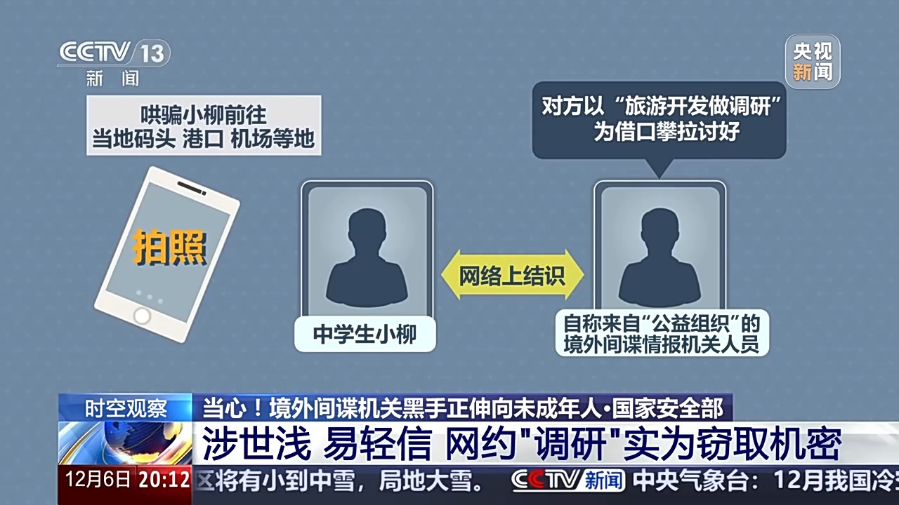 中學(xué)生小柳在網(wǎng)絡(luò)上結(jié)識了一名自稱來自“公益組織”的境外間諜情報機關(guān)人員,對方以“旅游開發(fā)做調(diào)研”為借口攀拉討好,哄騙小柳前往當(dāng)?shù)卮a頭、港口、機場等地拍照,逐步發(fā)展至收集有關(guān)重要軍事設(shè)施地點的照片和相關(guān)信息,小柳還因此收取了“酬勞”數(shù)千元。涉世未深的小柳在沒有意識到問題嚴(yán)重性的情況下輕易相信了對方,沒想到自己的行為已經(jīng)對我國軍事安全和國家安全構(gòu)成了嚴(yán)重威脅。