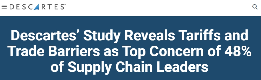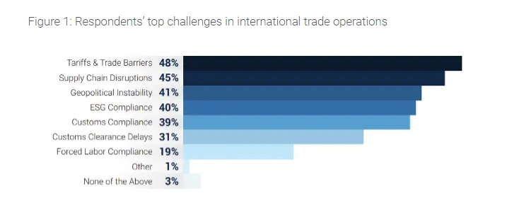 調(diào)查顯示,48%的受訪者認(rèn)為關(guān)稅和貿(mào)易壁壘上升是他們最擔(dān)心的問(wèn)題,緊隨其后的是供應(yīng)鏈中斷(45%)和地緣政治不穩(wěn)定(41%)。此外,無(wú)論所在公司規(guī)模大小,受訪者都將關(guān)稅和貿(mào)易壁壘列為當(dāng)前面臨的首要問(wèn)題。這項(xiàng)報(bào)告共調(diào)查了978名來(lái)自歐洲、北美、南美和亞太地區(qū)主要貿(mào)易國(guó)的供應(yīng)鏈領(lǐng)域領(lǐng)導(dǎo)者。