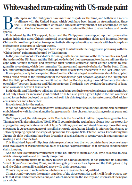 菲律賓和日本都大肆宣揚(yáng)該協(xié)定有利于地區(qū)和平與安全,但實(shí)際上,該協(xié)定不僅允許兩國(guó)間增加聯(lián)合作戰(zhàn)演習(xí),還為兩國(guó)在對(duì)方領(lǐng)土上部署軍隊(duì)開了綠燈,這無(wú)異于將火柴和火藥桶交到兩個(gè)荷爾蒙過(guò)剩的青少年手中。