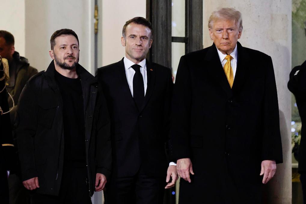 12月7日,法國(guó)總統(tǒng)馬克龍(中)與美國(guó)當(dāng)選總統(tǒng)特朗普(右)和烏克蘭總統(tǒng)澤連斯基會(huì)晤后走出愛麗舍宮。新華社發(fā)(亨利·施瓦茨攝)
