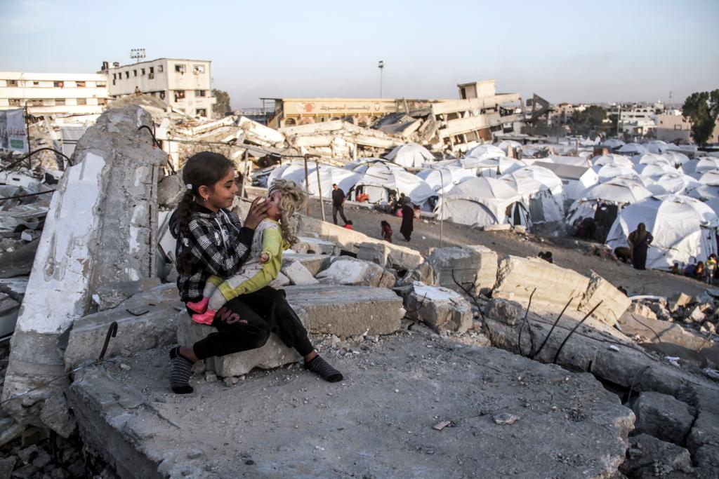 12月9日,在加沙地帶加沙城,一名流離失所的女孩在一處臨時(shí)帳篷區(qū)玩玩具。新華社發(fā)(馬哈茂德·扎基攝)