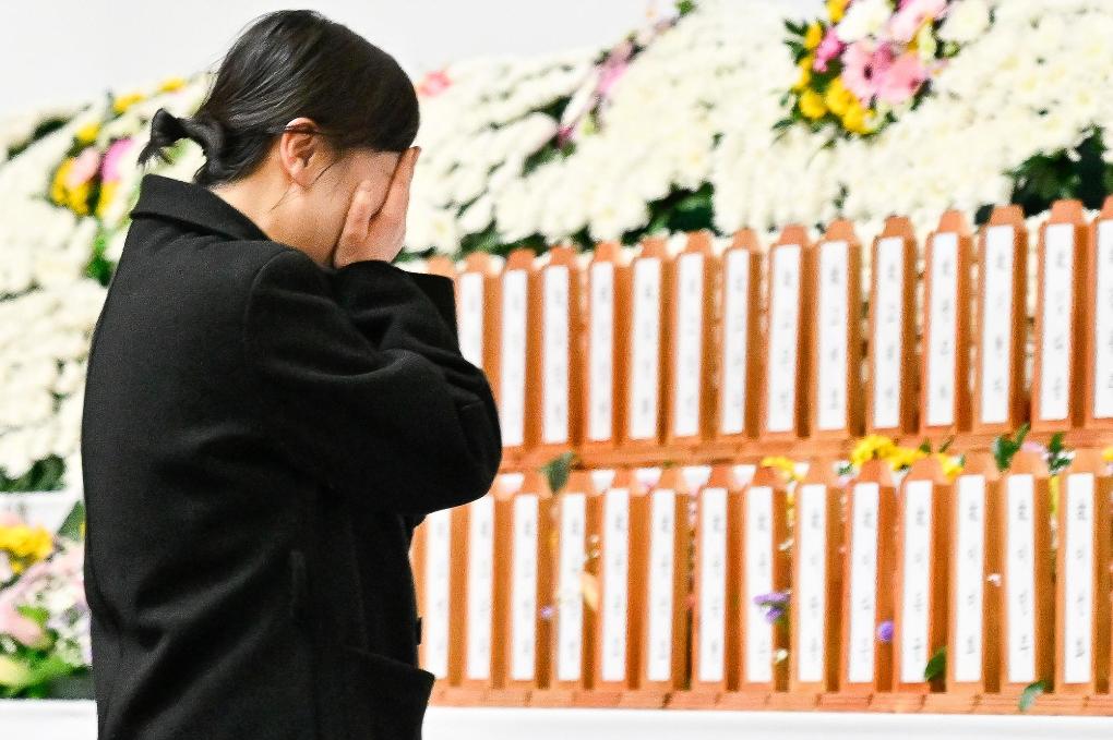 12月30日,遇難者家屬在韓國務安當?shù)卦O置的靈堂內(nèi)哀悼親人。新華社發(fā)(全休相攝)
