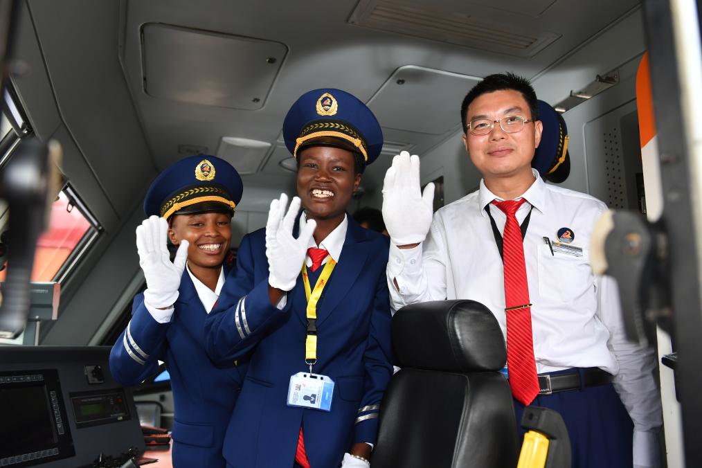 2017年5月31日,在肯尼亞蒙內(nèi)鐵路蒙巴薩西站,火車司機艾麗斯(左)、肯西莉亞(中)和旅客列車指導司機涂主新在蒙內(nèi)鐵路首班列車發(fā)車前揮手致意。(新華社記者孫瑞博攝)
