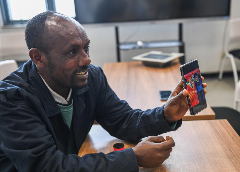 2024年2月15日,在位于亞的斯亞貝巴的埃塞俄比亞聯(lián)邦職業(yè)技術(shù)培訓學院,魯班工坊當?shù)亟處熂s納斯·阿凱萊(中文名艾友涵)展示在中國學習時的照片。(新華社記者李亞輝攝)