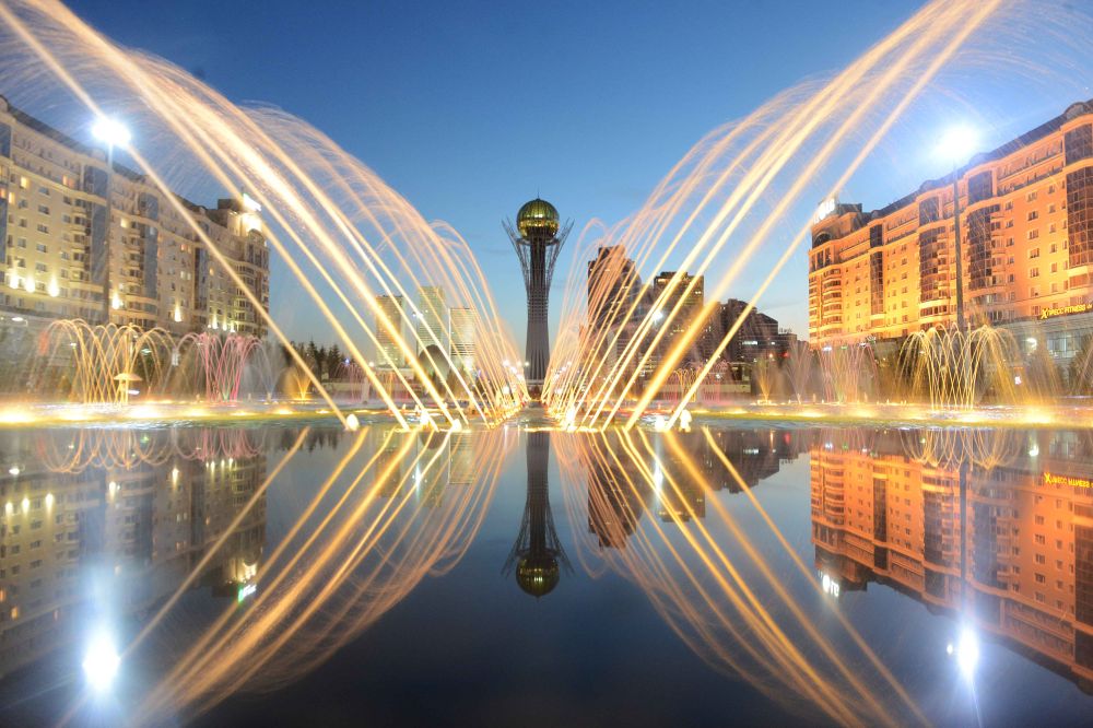 這是2017年6月11日拍攝的哈薩克斯坦首都阿斯塔納的巴伊杰列克觀景塔夜景。新華社記者沙達(dá)提攝