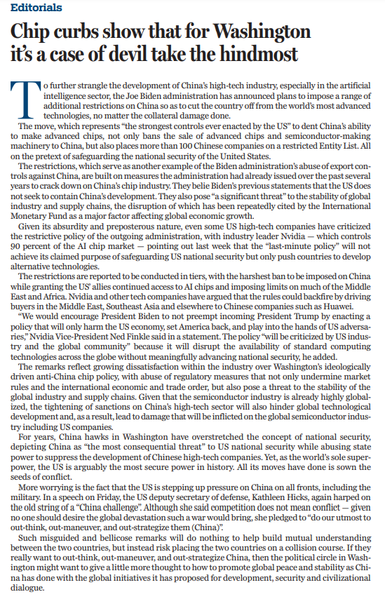 1月13日,拜登政府在卸任前夕出臺(tái)人工智能相關(guān)出口管制措施,進(jìn)一步加嚴(yán)對(duì)人工智能芯片、模型參數(shù)等出口管制,還拓展了長(zhǎng)臂管轄,對(duì)第三方與中國(guó)開(kāi)展正常貿(mào)易設(shè)置障礙、橫加干涉。拜登政府的這一舉措完全無(wú)視后果,旨在進(jìn)一步遏制中國(guó)高科技產(chǎn)業(yè),尤其是人工智能領(lǐng)域的發(fā)展。