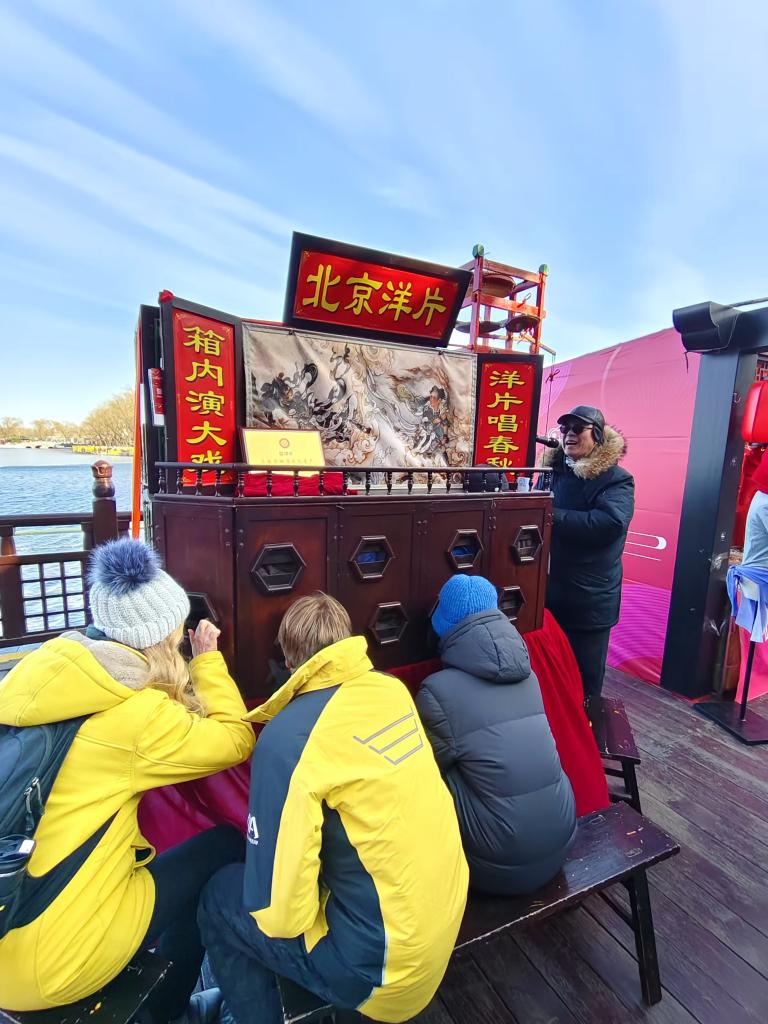 走入北京歷史文化街區(qū)什剎海的新春集市,年味彌漫在文化產(chǎn)品、特色小吃和藝術(shù)表演中。不遠處的鑼鼓唱戲聲吸引了母子二人,原來是民間藝術(shù)北京洋片在表演《西游記》。坐在一個約1米高、2米寬的木箱前,透過箱上圓孔能看到里面不斷切換的畫片。二人全神貫注的表情,讓人感到不同文化仿佛跨越時空和國度,在這里定格。
