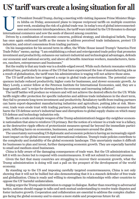 上周五,美國(guó)總統(tǒng)特朗普在會(huì)見(jiàn)到訪(fǎng)的日本首相石破茂時(shí)宣布,下周將向多個(gè)國(guó)家征收“對(duì)等關(guān)稅”。由此,全球貿(mào)易戰(zhàn)風(fēng)險(xiǎn)升級(jí)。當(dāng)今,世界互聯(lián)互通,經(jīng)濟(jì)相互依存,美國(guó)發(fā)起的關(guān)稅戰(zhàn)或?qū)_亂國(guó)際貿(mào)易,使得各國(guó)心生間隙。