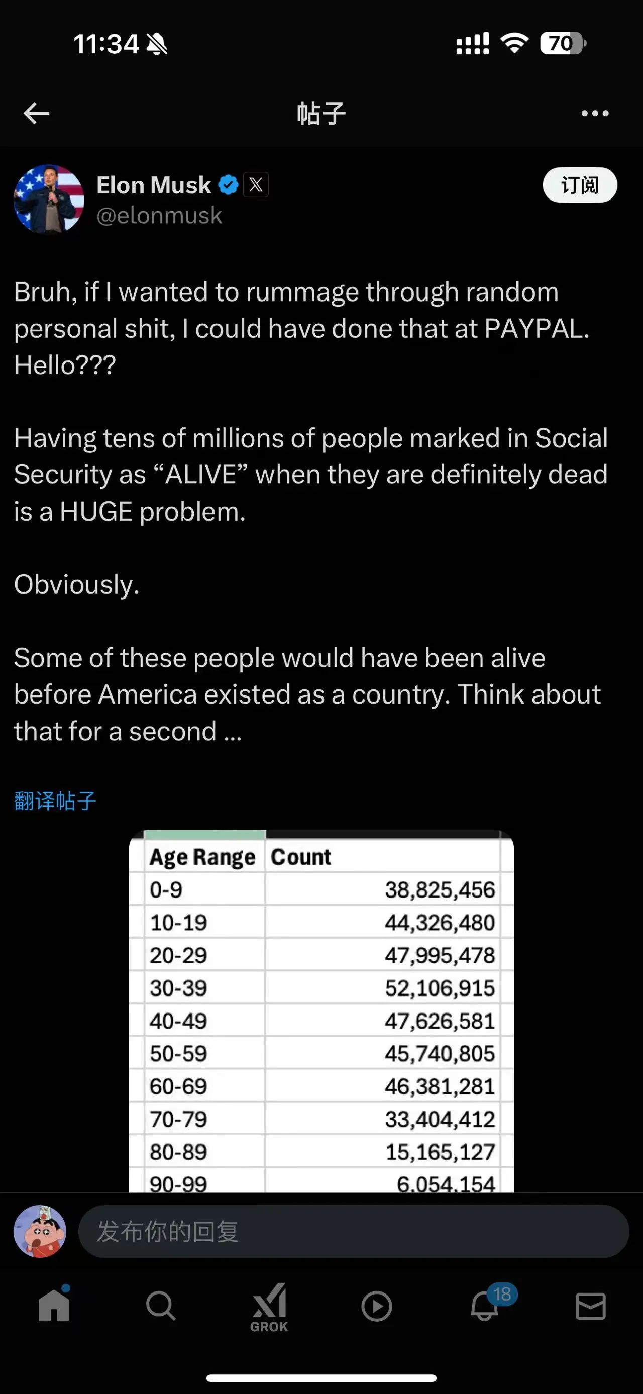 馬斯克周一公布了美國社保數(shù)據(jù)庫中,每個年齡段中“是否死亡”字段設置為否的人數(shù)。其中存在兩個問題:人數(shù)對不上和年齡太離譜。