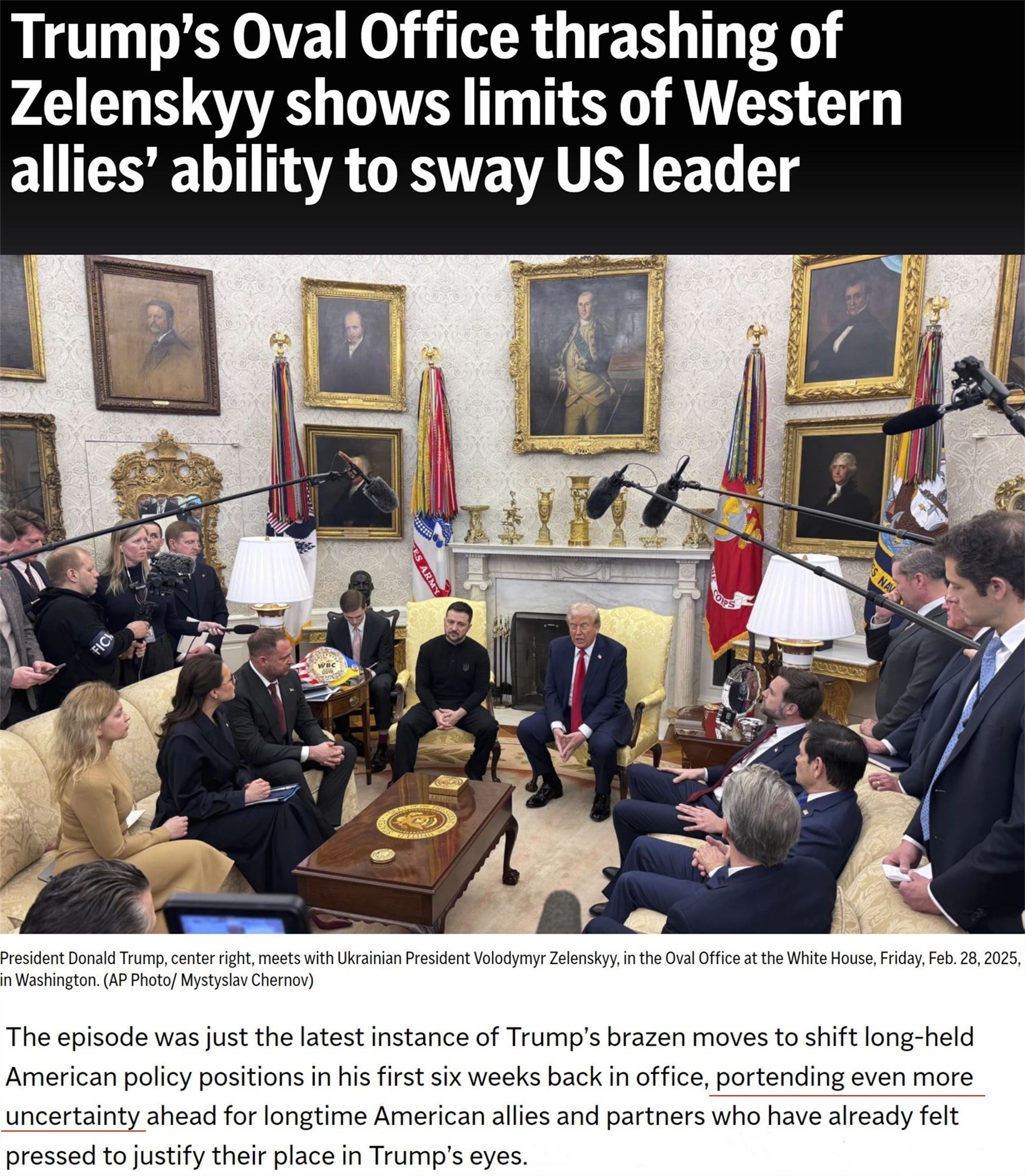 美國總統(tǒng)特朗普與到訪的烏克蘭總統(tǒng)澤連斯基2月28日在白宮當(dāng)著媒體的面“大吵一架”,引發(fā)國際輿論大嘩。