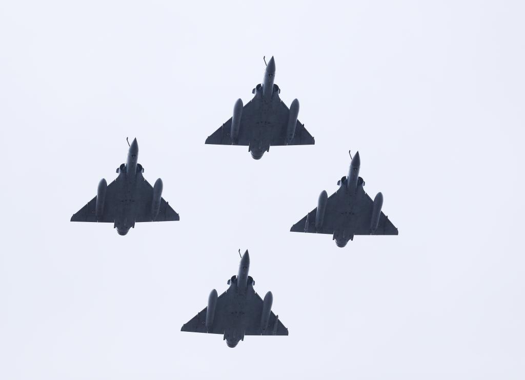 這是2021年7月14日在法國(guó)巴黎協(xié)和廣場(chǎng)國(guó)慶閱兵式現(xiàn)場(chǎng)拍攝的戰(zhàn)斗機(jī)編隊(duì)。新華社記者 高靜 攝