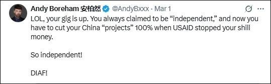“笑死,你們?nèi)嗽O(shè)崩了。”在中國(guó)生活和工作多年的新西蘭媒體人安迪·博勒姆(中文名安柏然)也嘲諷道,“成天標(biāo)榜自己‘獨(dú)立’,現(xiàn)在美國(guó)國(guó)際開(kāi)發(fā)署斷了黑錢,對(duì)華‘項(xiàng)目’得100%砍光。還真是獨(dú)立?。≮s緊涼透吧!”