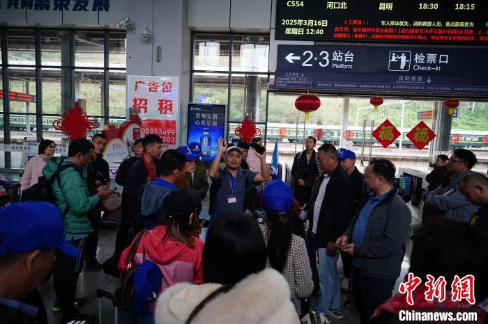 3月16日,云南省紅河州河口縣河口北站,一位導(dǎo)游組織越南旅游團(tuán)候車。中新社記者 劉冉陽(yáng) 攝