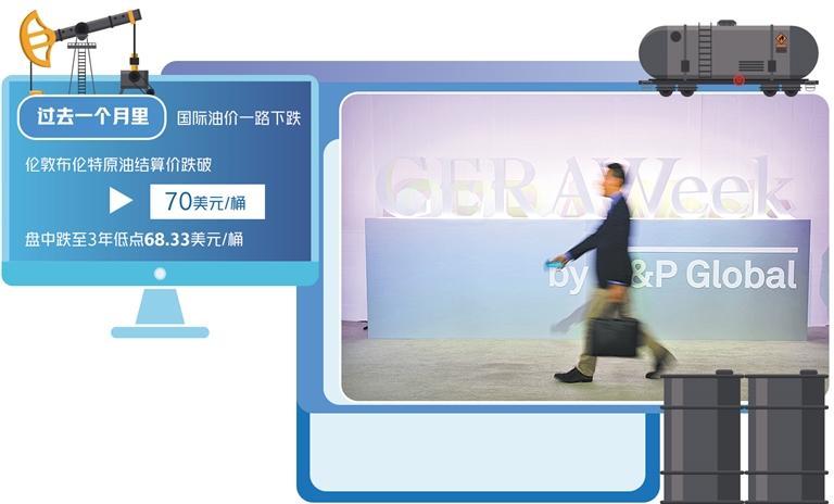 先看最近國際油價的走勢。一方面是油價隨著美國的關稅戰(zhàn)威脅而劇烈波動,并且跌到半年來的最低點。統(tǒng)計數(shù)據(jù)表明,在過去一個月里,國際油價一路下跌,倫敦布倫特原油期貨結算價跌破70美元/桶,盤中更是跌至3年低點68.33美元/桶。自特朗普就職以來,國際油價每桶平均價格已經下跌了10美元之多。
