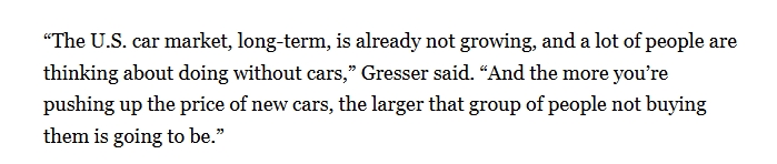 “從長期來看,美國汽車市場已不再增長,越是推高新車價(jià)格,不買車的人就會越多。”