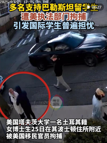 新華社北京3月28日電 據(jù)美國媒體報道,塔夫茨大學土耳其籍博士生魯梅伊莎·厄茲蒂爾克25日在其波士頓住所附近遭美國移民官員拘捕。自唐納德·特朗普就任總統(tǒng)以來,已有多名在美外國留學生因支持巴勒斯坦而遭拘捕或被驅逐出境。