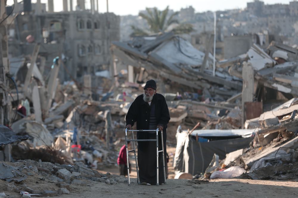 3月22日,一名從加沙地帶北部拜特拉希耶撤離的巴勒斯坦老人經過加沙城。新華社發(fā)(阿卜杜勒·拉赫曼·薩拉馬攝)