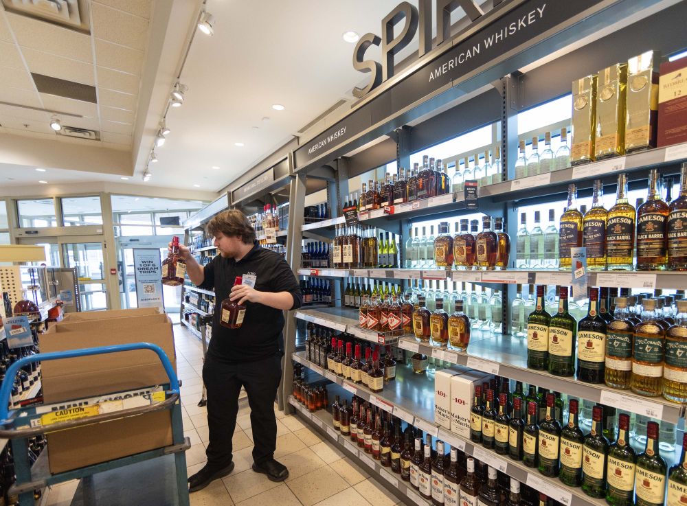 2025年3月4日,在加拿大安大略省的奧克維爾,一酒商門(mén)店的店員從貨架上撤下美國(guó)品牌酒產(chǎn)品。新華社發(fā)(鄒崢攝)