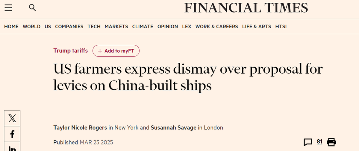 另據(jù)英國《金融時(shí)報(bào)》報(bào)道,美國中西部農(nóng)民非常擔(dān)憂,加征“港口費(fèi)”必將進(jìn)一步削弱農(nóng)產(chǎn)品出口競爭力。美國大豆出口委員會(huì)首席執(zhí)行官吉姆·薩特表示,整個(gè)行業(yè)對(duì)提案“措手不及”。
