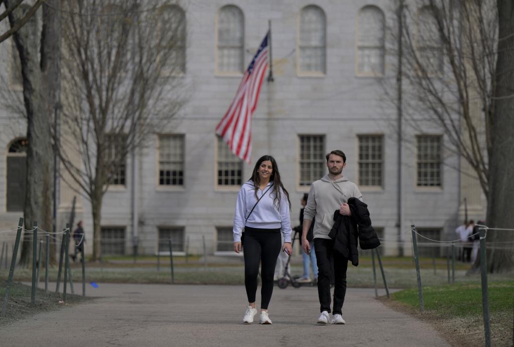 4月15日,人們漫步在美國馬薩諸塞州劍橋市的哈佛大學(xué)校園內(nèi)。新華社/路透
