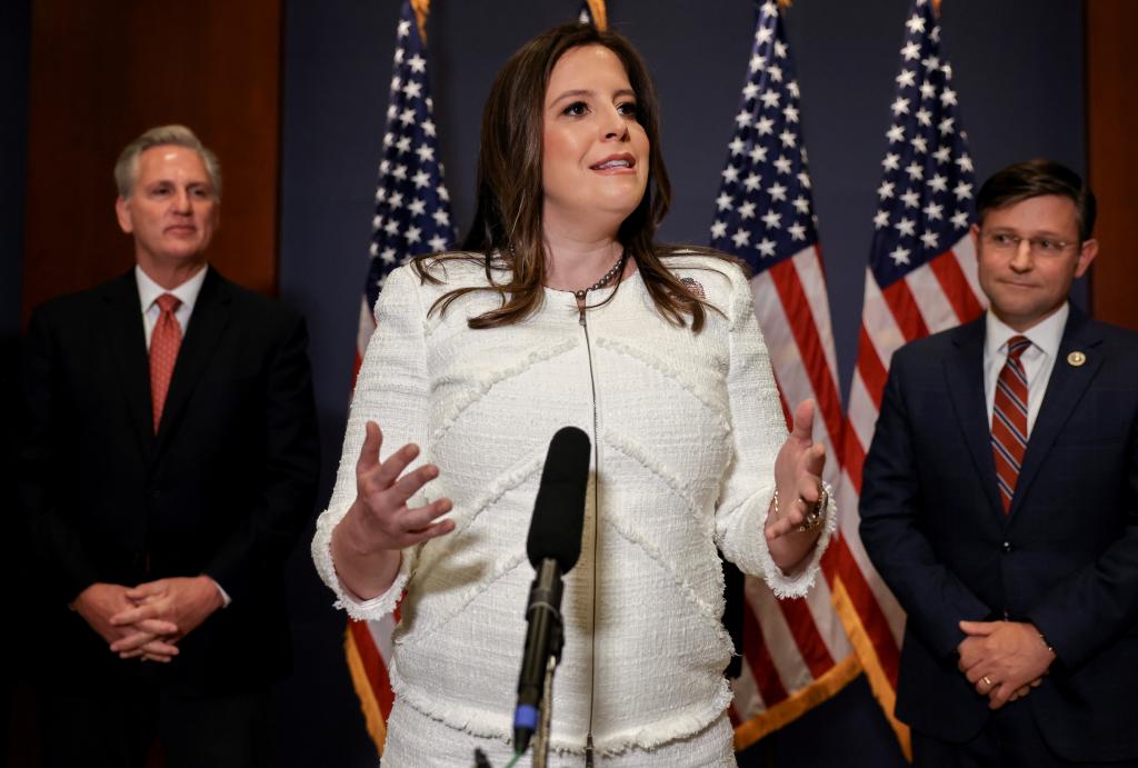2021年5月14日,美國紐約州共和黨籍聯(lián)邦眾議員愛麗絲·斯蒂芬尼克在華盛頓國會(huì)山向記者講話。新華社/路透