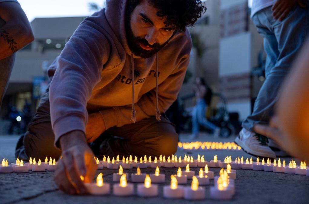 2024年10月7日,新一輪巴以沖突爆發(fā)一周年之際,在美國加利福尼亞州洛杉磯,加利福尼亞大學(xué)洛杉磯分校的學(xué)生們參加集會(huì)活動(dòng)時(shí)點(diǎn)亮蠟燭。新華社/美聯(lián)