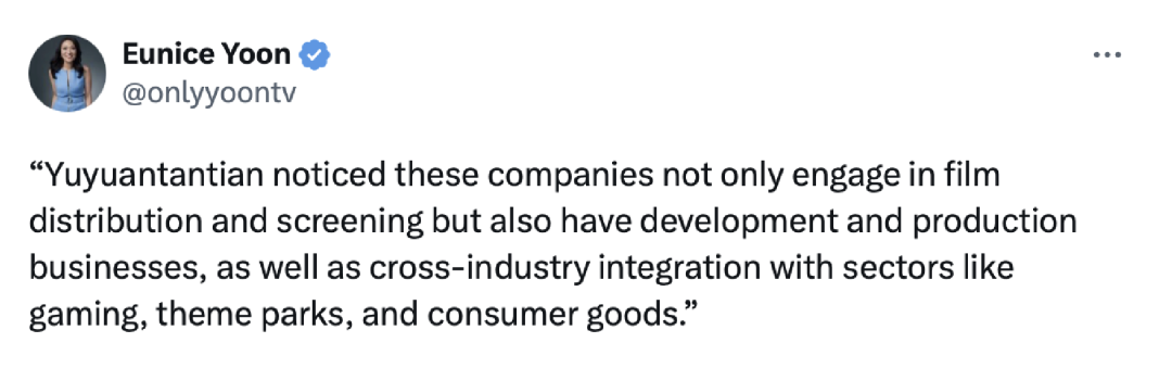 除此之外,譚主此前也就國家電影局的相關(guān)表態(tài)做過解讀。當(dāng)時(shí)就說了一個(gè)觀點(diǎn),如果中國消費(fèi)者開始在電影領(lǐng)域減少選擇美國產(chǎn)品,這種趨勢很可能會(huì)外溢到其他領(lǐng)域,很多國際媒體做了轉(zhuǎn)引。