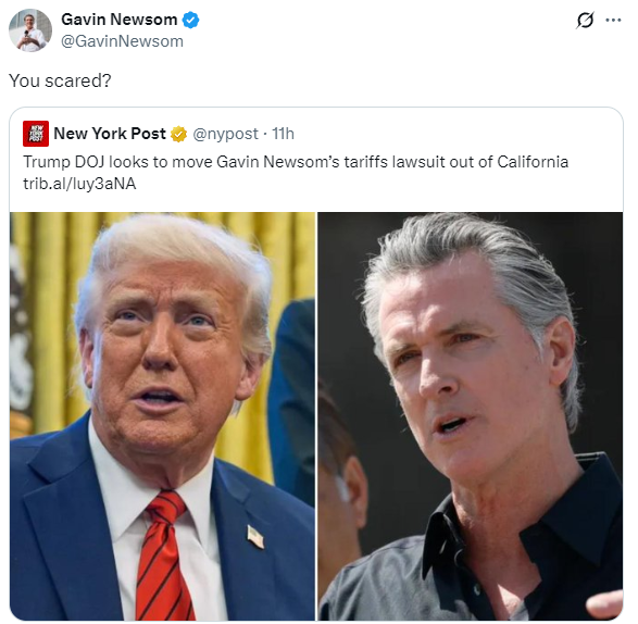 18日,美國加州州長加文·紐森在社交媒體上發(fā)聲,他轉發(fā)了一則《紐約郵報》的新聞消息。這則新聞標題為《特朗普的司法部似乎希望把紐森關稅訴訟的審理地挪出加州》。紐森在轉發(fā)消息時附加了一句評論:“你害怕了嗎?”