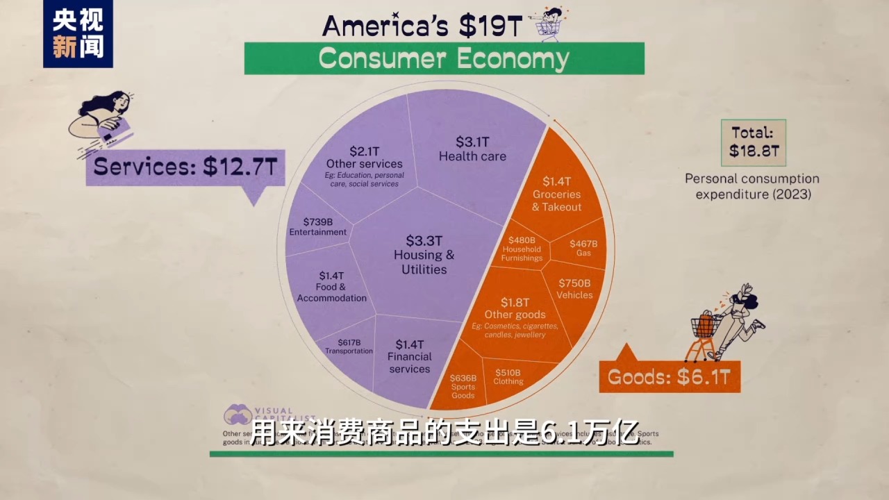 按美國勞動局?jǐn)?shù)據(jù),美國人2023年消費支出18.8萬億美元,其中12.7萬億花在了看病、租房、交學(xué)費、打官司等服務(wù)上,用來消費商品的支出是6.1萬億,不到總消費的三分之一。所以吹噓美國消費能力強(qiáng)屬實是個“地獄笑話”,看病花錢多有什么可驕傲的?