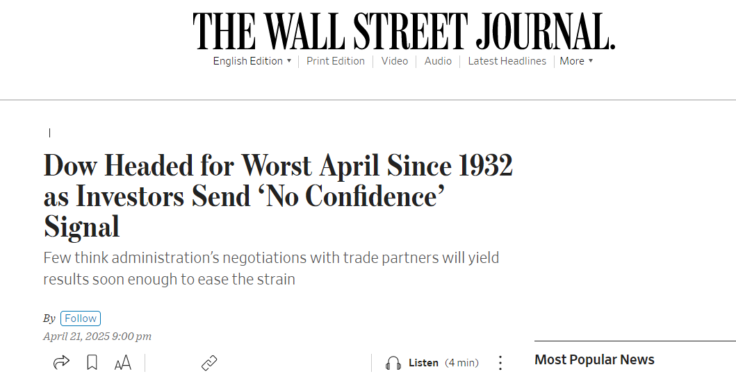 另據(jù)《華爾街日報》4月21日報道,道指或?qū)?chuàng)下近百年來最差4月表現(xiàn),投資者發(fā)出“不信任”信號。