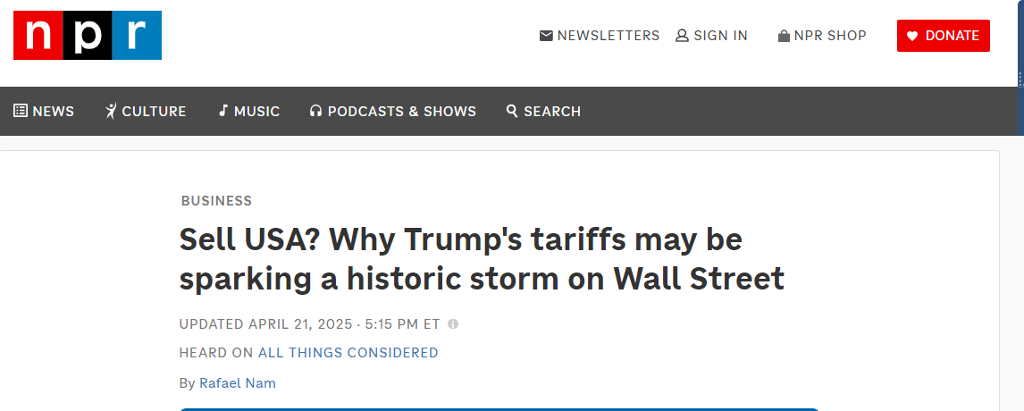 據(jù)美國國家公共廣播電臺(NPR)網(wǎng)站4月21日報道,美國金融體系過去被視為全球最穩(wěn)定和強大的體系之一。然而,由于美國現(xiàn)任政府4月2日推出的所謂全球“對等關(guān)稅”政策,美國金融市場出現(xiàn)了前所未有的危機:全球投資者可能因美國政策的不確定性而對美國失去信心。