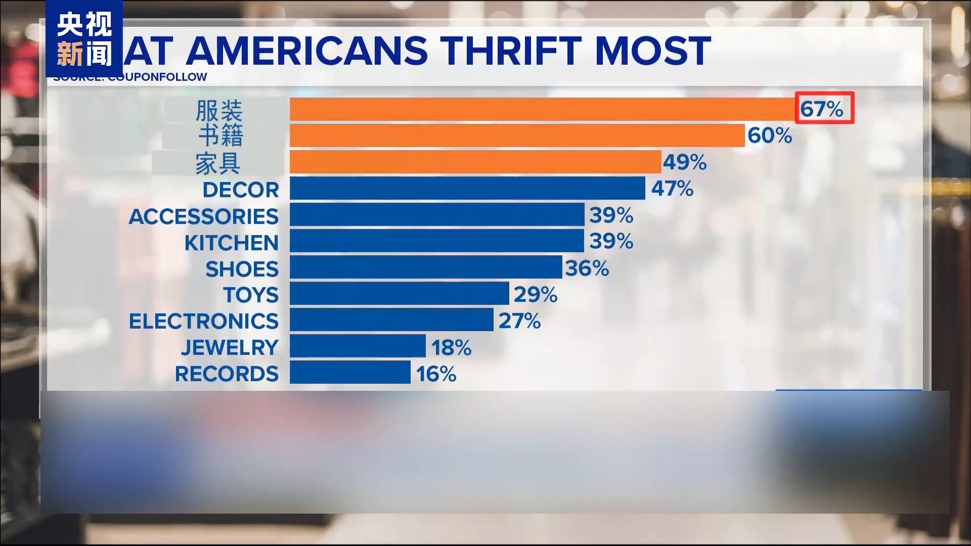 美國一家在線交易平臺(CouponFollow)的一組調(diào)查數(shù)據(jù)顯示,67%的美國消費者選擇在二手市場購買服裝,60%的人購買書籍,近50%的人購買家具。
