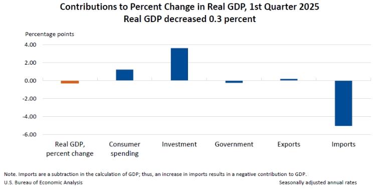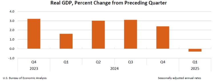 4月30日,美國(guó)商務(wù)部公布了2025年美國(guó)一季度經(jīng)濟(jì)數(shù)據(jù),美國(guó)一季度國(guó)內(nèi)生產(chǎn)總值環(huán)比(按年率計(jì)算)萎縮0.3%,為三年來(lái)首次負(fù)增長(zhǎng)。