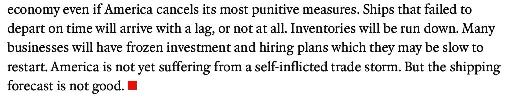 未能按時(shí)起航的船只將會(huì)延遲抵達(dá),或者根本無(wú)法抵達(dá)。庫(kù)存將會(huì)耗盡。許多企業(yè)可能已經(jīng)凍結(jié)了投資和招聘計(jì)劃,而且恢復(fù)這些計(jì)劃可能會(huì)很緩慢。美國(guó)尚未遭受自己一手造成的貿(mào)易風(fēng)暴的沖擊。但航運(yùn)前景不容樂(lè)觀。