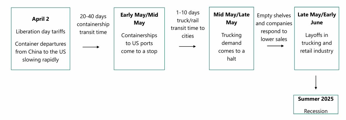 按其時(shí)間表所述,第一波次將在5月上旬至中旬發(fā)生。在經(jīng)歷三個(gè)階段后,在2025年夏季,美國(guó)經(jīng)濟(jì)陷入衰退,具體“四步走”的階段如下: