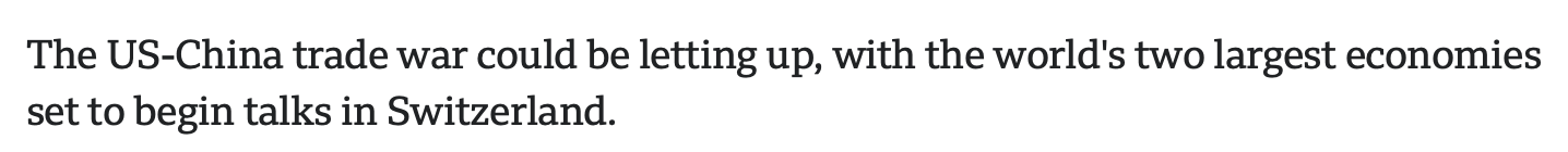 英國廣播公司的報道稱,隨著世界兩大經濟體即將在瑞士開始會談,中美貿易戰(zhàn)可能正在緩和。