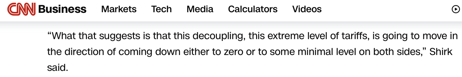 美國有線電視新聞網的報道注意到美國財政部長貝森特此前關于“本周末的談判將側重于緩和緊張局勢”的表態(tài)。報道援引加州大學圣迭戈分校全球政策與戰(zhàn)略學院研究教授、21世紀中國研究中心名譽主任蘇珊·希爾克的觀點指出,這表明美中之間“脫鉤、極端的關稅水平,將朝著降至零,或是降至最低水平的方向發(fā)展”。