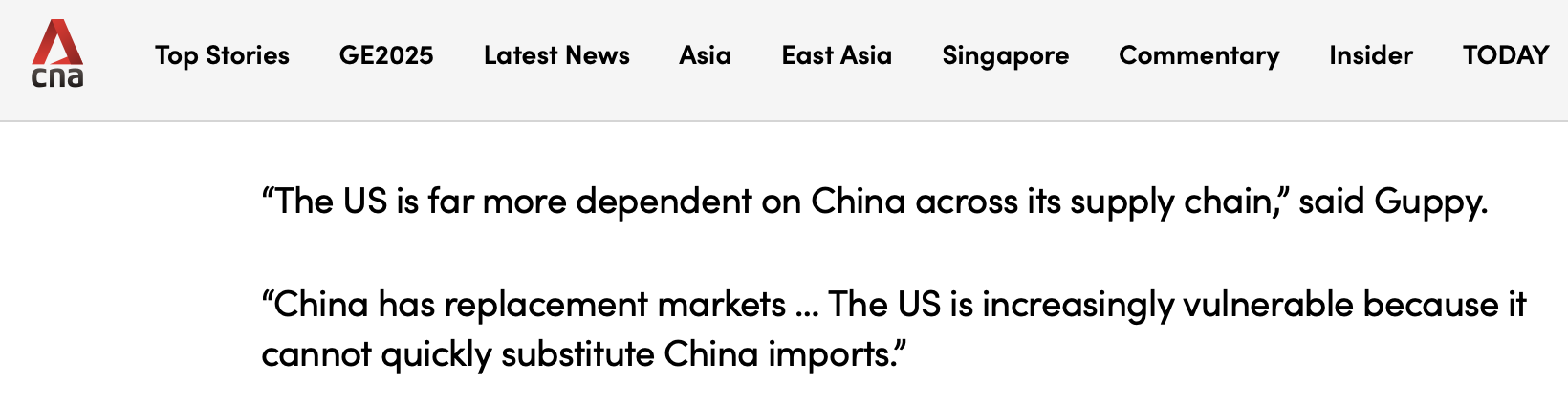 報道稱,澳大利亞金融專欄作家戴若·顧比表示,“美國整個供應鏈對中國的依賴程度要高得多”,“中國有替代市場……美國則越來越脆弱,因為它無法迅速找到中國進口產品的替代品”。