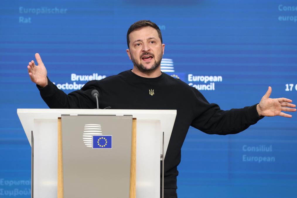 2024年10月17日,在比利時(shí)布魯塞爾,烏克蘭總統(tǒng)澤連斯基在歐盟峰會(huì)上參加新聞發(fā)布會(huì)。新華社記者趙丁喆攝